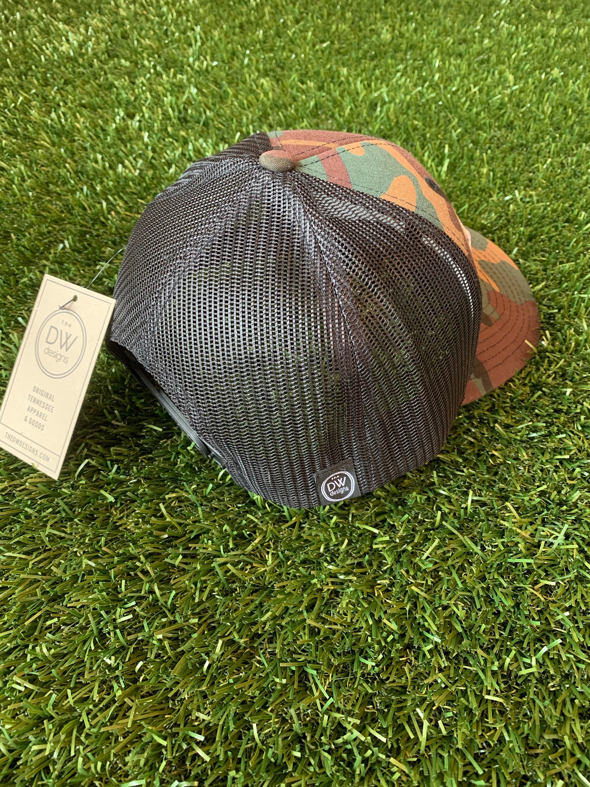 Rep TN in style. This trucker hat features our original TN Stars patch design. Camo trucker hat with black mesh and our DW logo clip tag on the side for authenticity.